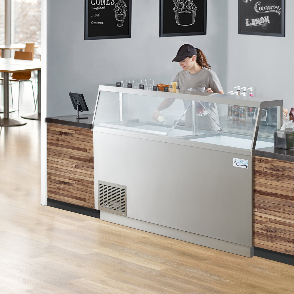 Display, merchandise, and serve a delicious variety of ice cream flavors with this Avantco CPSS-88-HC stainless steel deluxe ice cream dipping cabinet! Holding up to 16 ice cream tubs at a time, the unit is perfect for ice cream shops, candy stores, dessert bars, and cafeterias. The frozen storage space beneath the display even provides six epoxy-coated shelves for holding up to 12 tubs of back-up flavors, making it a convenient unit for businesses with limited space.