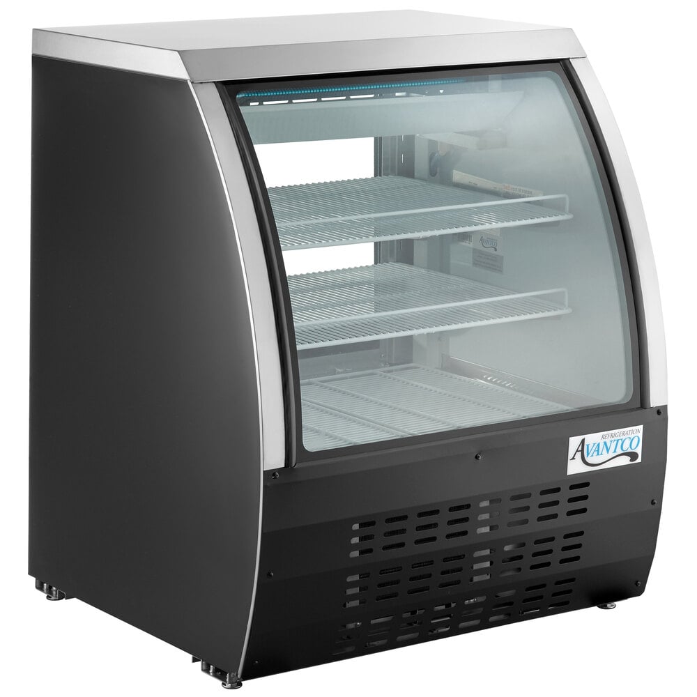 Great for cafes and delis, the Avantco DLC36-HC-B 36" black curved glass refrigerated deli case provides 10 cu. ft. of display space for merchandising parfaits, specialty sandwiches, and pre-packaged salads. Organize and display your product inventory on the 3 epoxy-coated steel shelves, each of which accommodate up to 132 lb. of weight. This provides plenty of strength to showcase your largest pre-wrapped subs, trays of sliced fruit, or dense, grain-based salads. Plus, the interior floor is made of type 304 stainless steel to withstand the inevitable spill or leak, helping to maintain the cabinet's integrity throughout the years. The 2 access doors easily slide open for efficient loading and service.