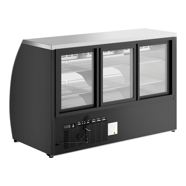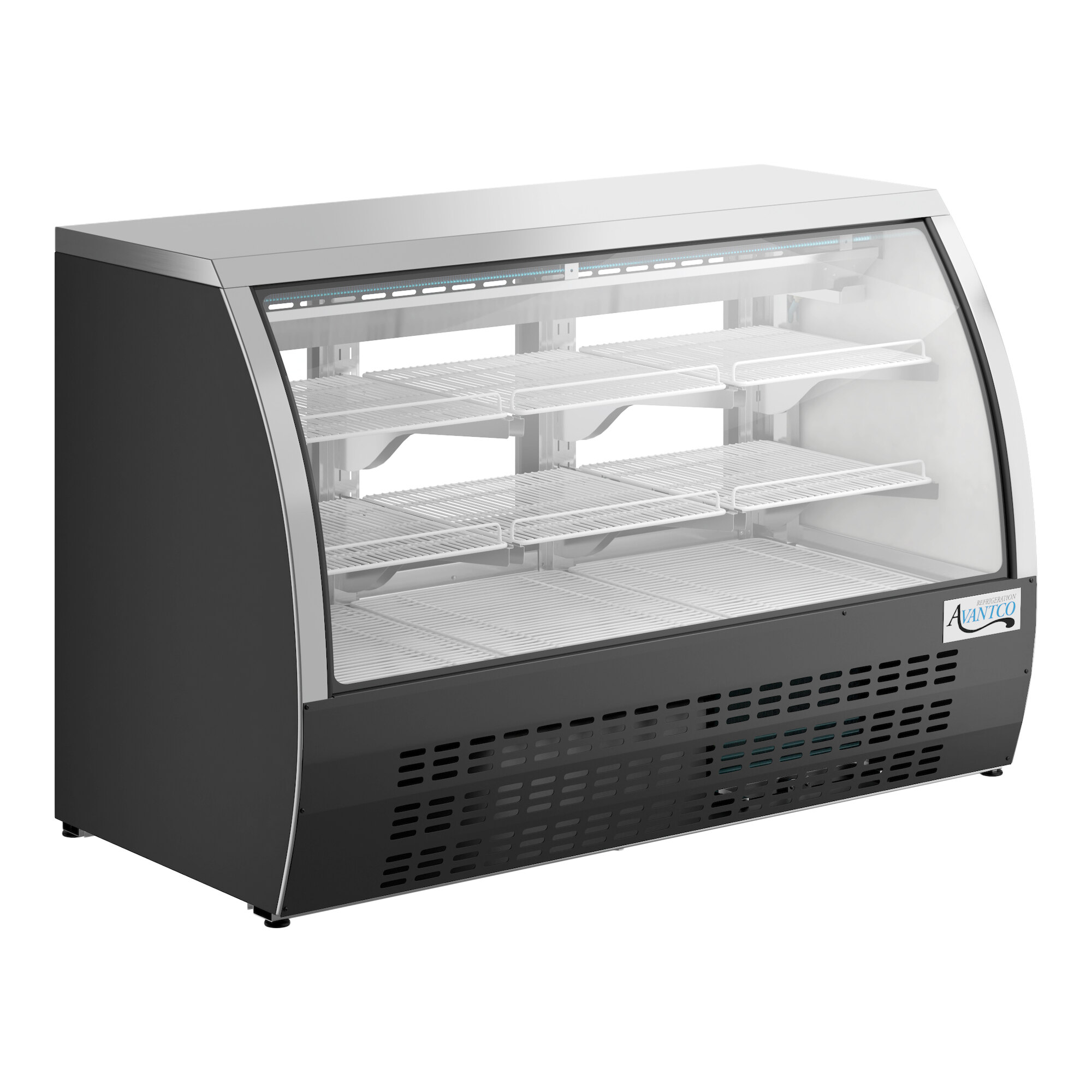 Great for cafes and delis, the Avantco DLC64-HC-B 64" black curved glass refrigerated deli case provides 18.8 cu. ft. of display space for merchandising parfaits, specialty sandwiches, and pre-packaged salads. Organize and display your product inventory on the 9 epoxy-coated steel shelves, each of which accommodate up to 132 lb. of weight. This provides plenty of strength to showcase your largest pre-wrapped subs, trays of sliced fruit, or dense, grain-based salads. Plus, the interior floor is made of type 304 stainless steel to withstand the inevitable spill or leak, helping to maintain the cabinet's integrity throughout the years. The 3 access doors easily slide open for efficient loading and service.
