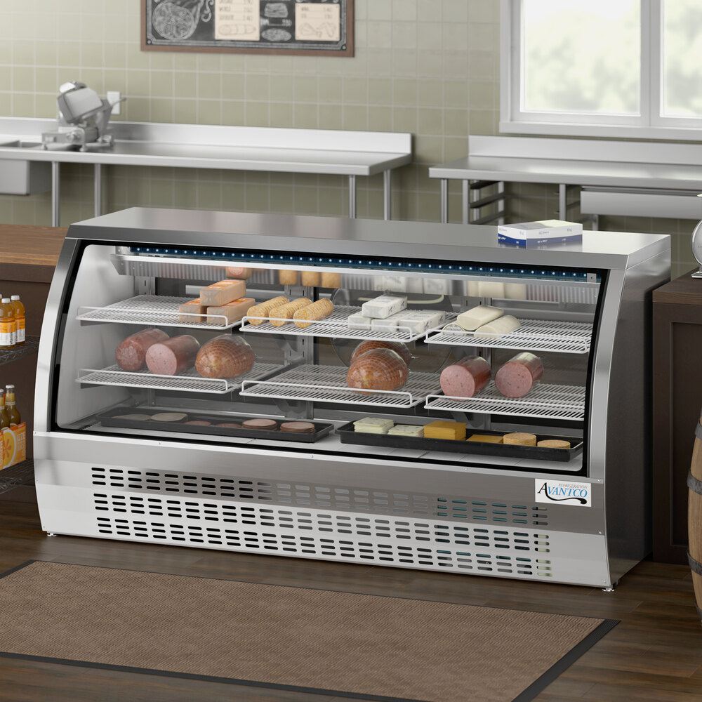 Attractively present your fresh cheese, meat, and other refrigerated deli items with the Avantco DLC47-HC-S 47" stainless steel curved glass refrigerated deli case! With a smooth, curved glass design, this contemporary case keeps contents sanitary while beautifully displaying them on nine epoxy-coated shelves. Crisp, internal LED lighting provides superior visibility for your products. Having a deli case is sure to boost your impulse sales, because customers can clearly see the products you're offering behind the strong, damage-resistant glass front. A stainless steel exterior combines with the painted aluminum and 304 stainless steel interior for long-lasting durability.