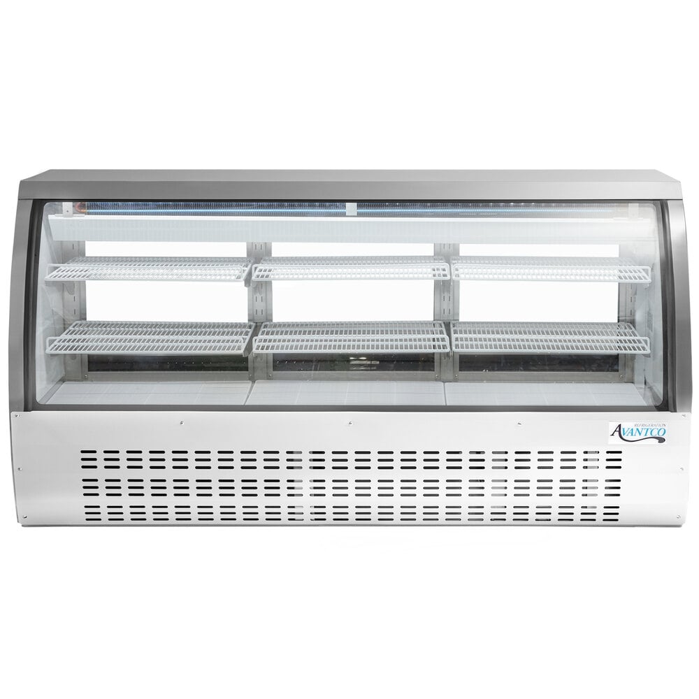 Attractively present your fresh cheese, meat, and other refrigerated deli items with the Avantco DLC82-HC-W 82" white curved glass refrigerated deli case! With a smooth, curved glass design, this contemporary case keeps contents sanitary while beautifully displaying them on nine epoxy-coated shelves. Crisp, internal LED lighting provides superior visibility for your products. Having a deli case is sure to boost your impulse sales, because customers can clearly see the products you're offering behind the strong, damage-resistant glass front. A durable white coated steel exterior combines with the painted aluminum and 304 stainless steel interior for long-lasting durability.