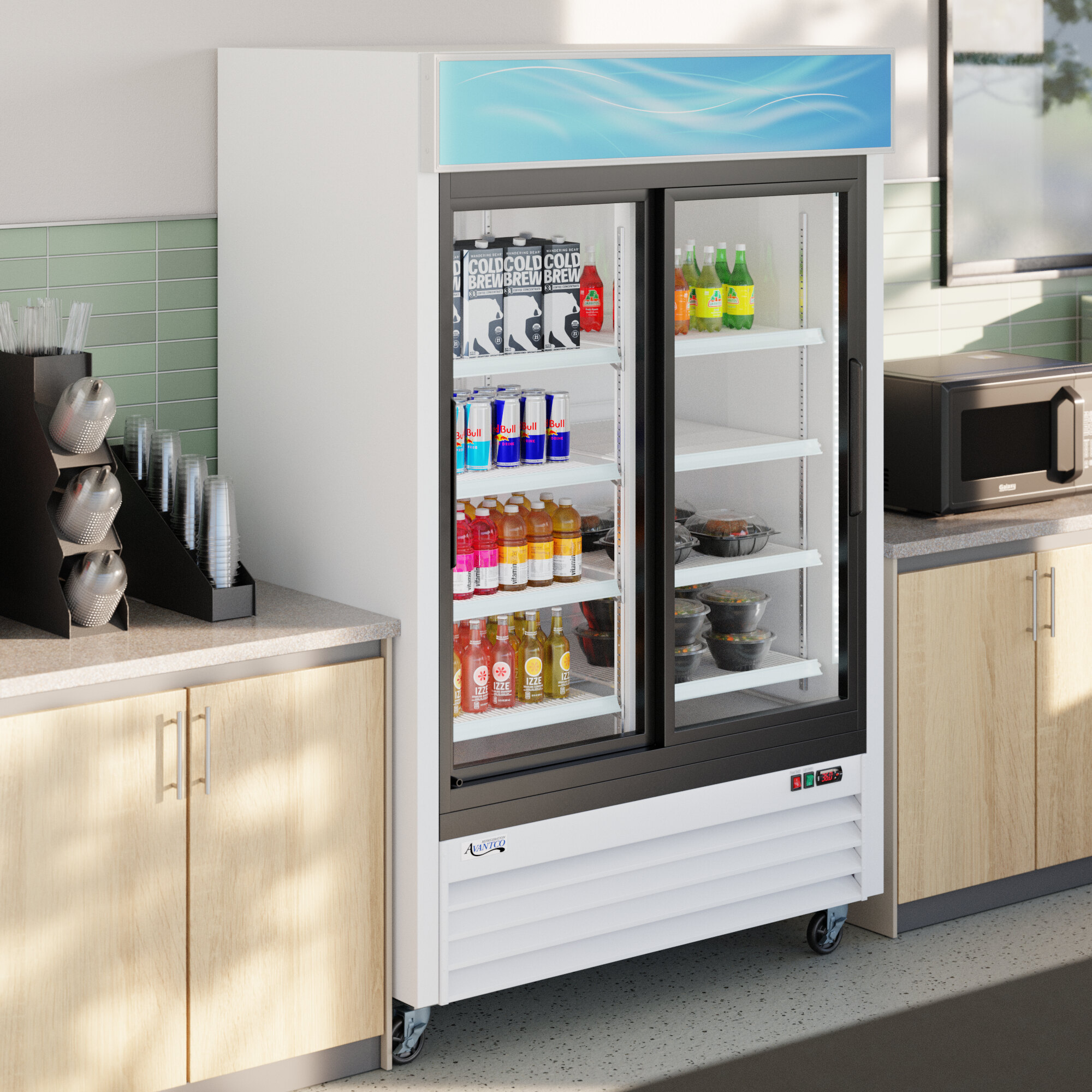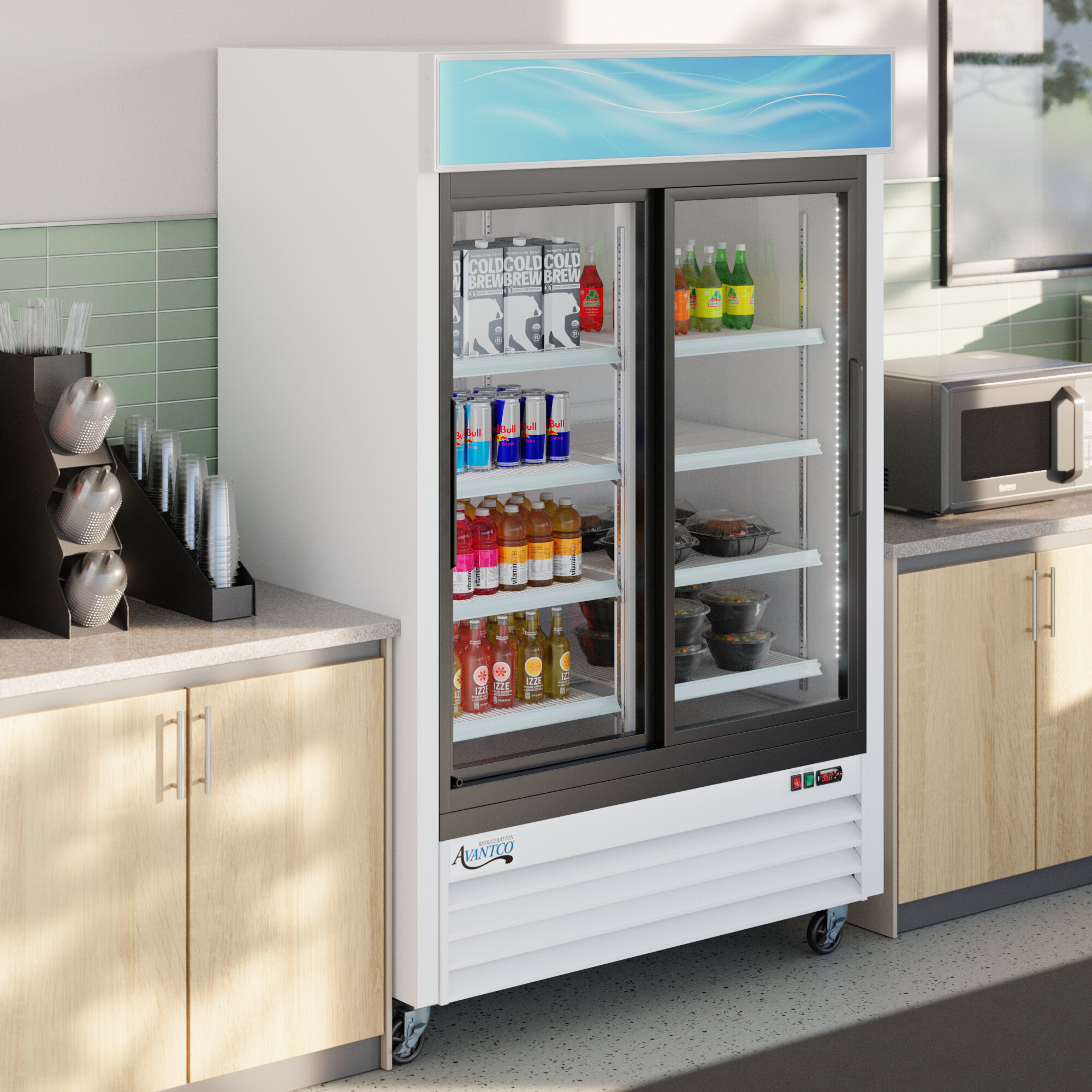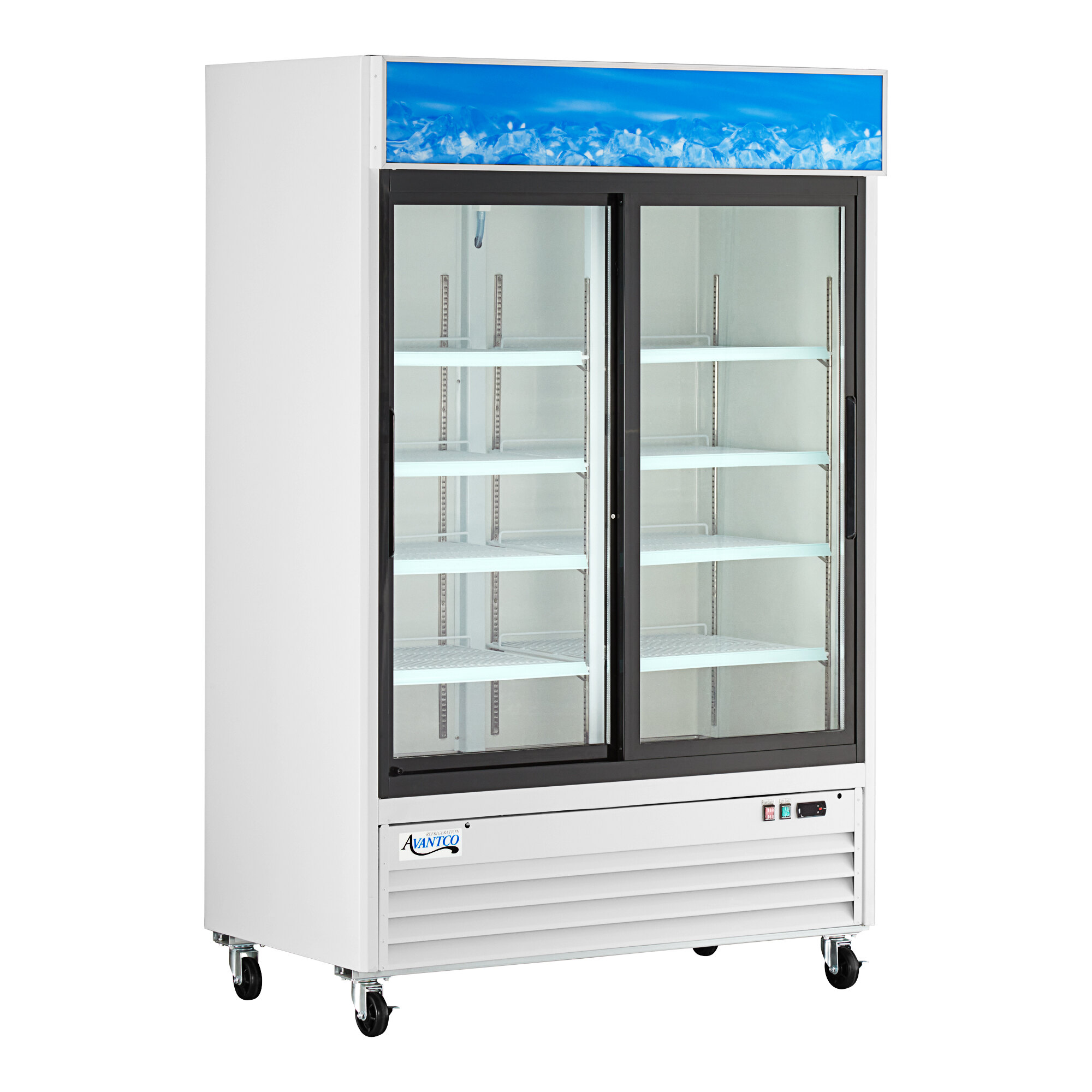 Increase your sales of "grab and go" items like bottled tea and soda, or pre-packaged sandwiches and salads with this Avantco GDS-47-HC 53 1/8" white merchandising refrigerator! Designed with sharp looks and usability in mind, this unit is the perfect display for your products with its sleek white finish and a lighted top graphics area. And, since the housing is made from white coated steel, you can be sure that it will provide superior durability. Additionally, it boasts anti-fogging glass sliding doors to ensure that customers always have a clear view of your products, while (8) plastic coated steel shelves help you stay organized. Plus, the shelves easily adjust to accommodate changing inventory and menus. Interior LED lighting on the right side also works to illuminate and further merchandise your products.