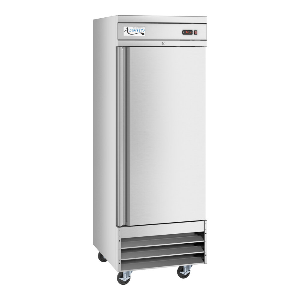 Providing impressive performance and dependable durability, this Avantco SS-1R-HC 29" stainless steel solid door reach-in refrigerator is engineered to hold your cold food investments in a food safe environment. Designed with a 430 stainless steel door and exterior sides, the unit features a sleek appearance that's matched with its ability to withstand busy, heavy-use kitchens. Plus, the interior is 304 stainless steel, giving the unit superior corrosion resistance and cleanability; it won't become damaged by inevitable spills and messes. As a result, it's easier for your employees to maintain during the hustle and bustle of their daily tasks. For ultimate storage flexibility, this refrigerator even comes with 3 epoxy coated shelves with a versatile shelf slide design that can accept full size food pans! Designed for your utmost convenience, the unit is sure to accommodate your ever-evolving needs as your business grows, expands, and transforms over time. This unit also boasts interior LED lighting that automatically turns on and off when you open and close the door. This helps improve visibility and streamline your work flow.