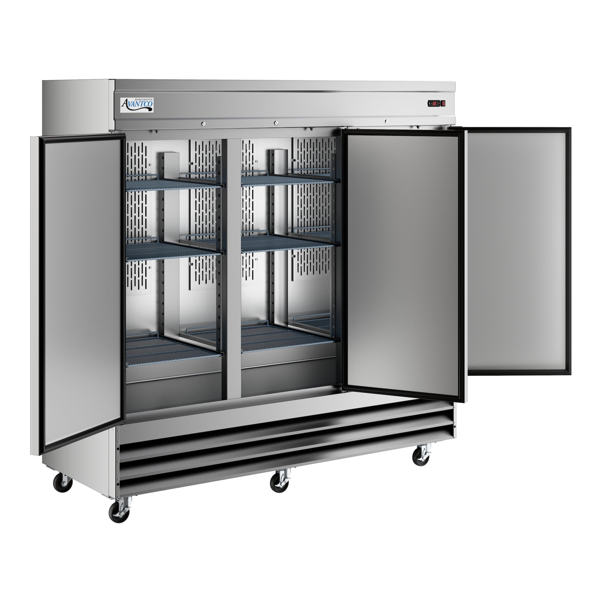 Making the freezer easy to monitor and operate, an automatic defrost feature and a digital temperature control with digital display are integrated for intuitive use. Each solid door includes a self-closing mechanism, which enables easy access at all times, and a set of casters provides the unit with mobility. This item requires a 115V electrical connection for operation.
