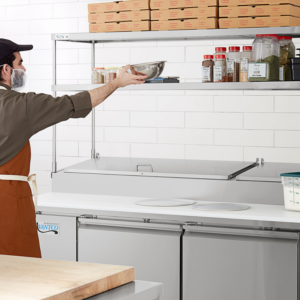 Measuring 93 13/16" wide, this overshelf is designed to fit select 93" long Avantco pizza prep refrigerators. Be sure you're maximizing all available space in your kitchen with this overshelf!