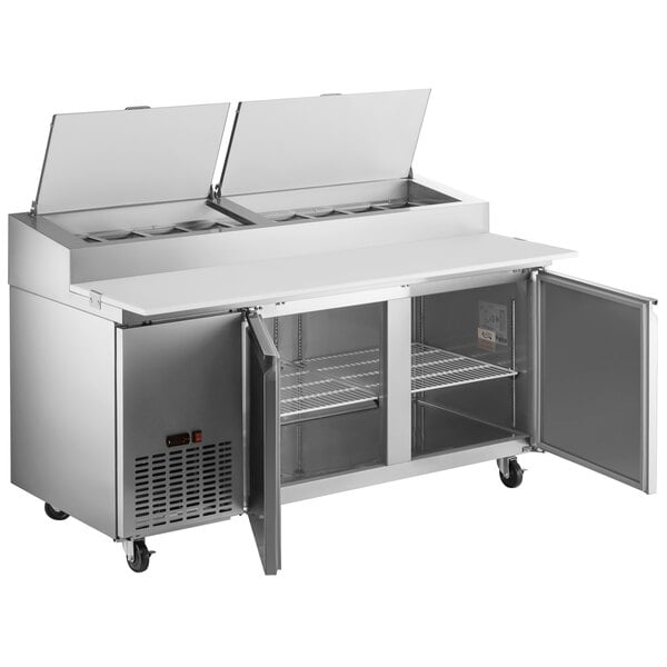 Optimize your back-of-house operations with this Avantco SSPPT-2 68" 2 door refrigerated pizza prep table, and better keep up with customer demands. Whether used in a university, pizza parlor, or resort, this unit is sure to streamline the pizza preparation process with its convenient features and capacity. Its top rail, for instance, accommodates up to (8) 1/3 size food pans up to 6" deep (sold separately). These pans are great for holding common pizza toppings, from pepperoni and cheese to green pepper or ham. Plus, a lift-up lid encloses the pan rail to maintain proper, food safe temperatures. A full-length cutting board, which is 19 7/16" deep, is mounted to the table surface, providing a place for slicing ingredients and assembling pies. Divider bars are also included for ultimate convenience.