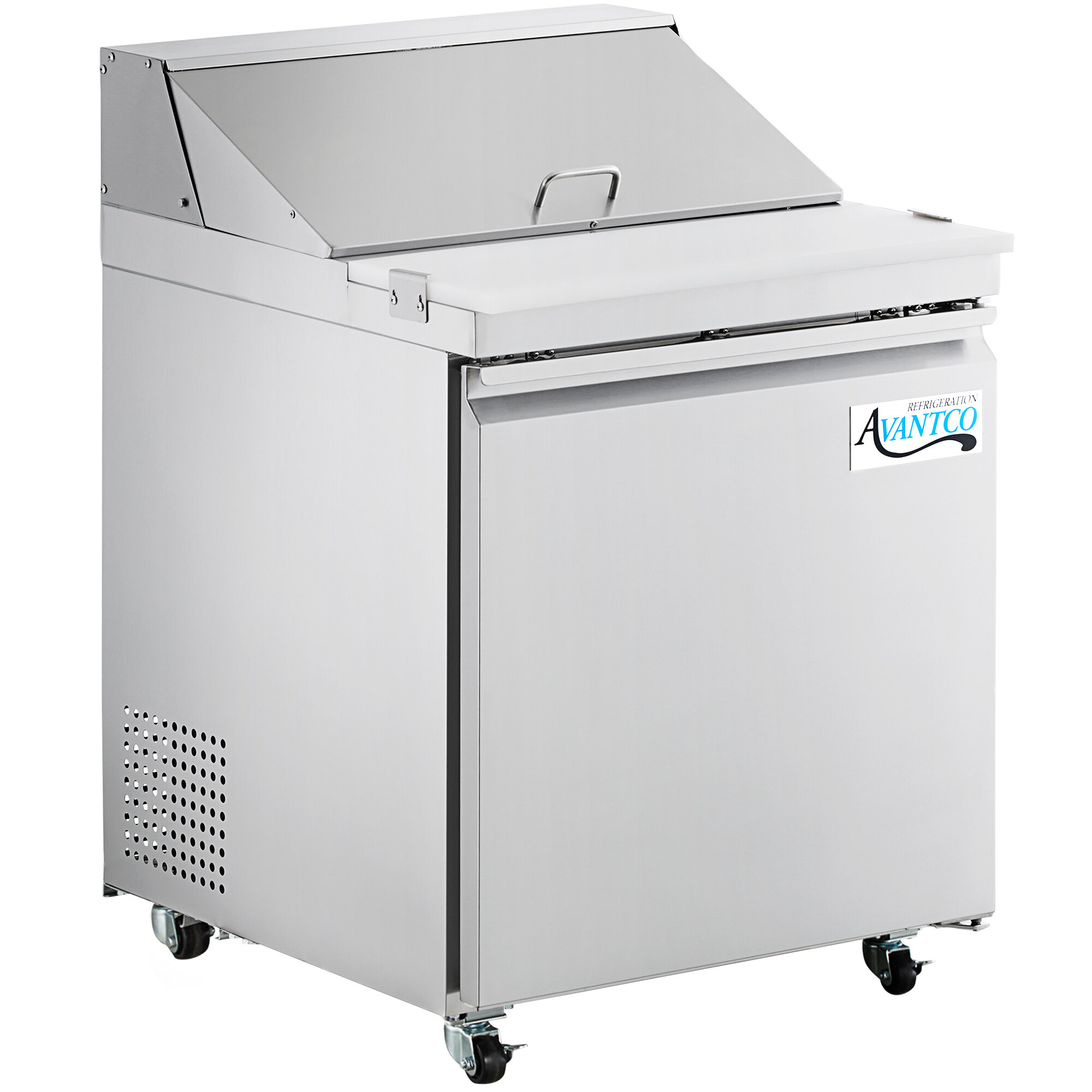Optimize your back-of-house operations with this Avantco SS-PT-27-HC 27" 1 door stainless steel refrigerated sandwich prep table, and better keep up with customer demands. Whether used in a university, sub shop, or hospital, the unit is sure to help streamline the sandwich prep process with its convenient features and capacity. Its top, for instance, accommodates up to (6) 1/6 size and (2) 1/9 size food pans up to 6" deep (sold separately). These are great for holding common sandwich or salad toppings, from eggs and cheese to green pepper or ham. Plus, a lift-up lid encloses the top to maintain proper, food safe temperatures. A full-length cutting board, which is 10 1/2" deep, is mounted to the table surface, providing a place for slicing ingredients and assembling orders.