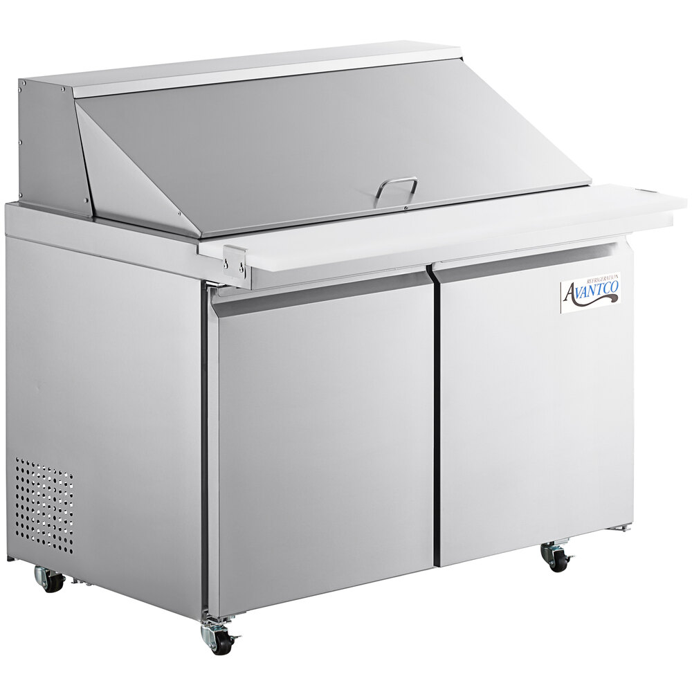 Optimize your back-of-house operations with this Avantco SS-PT-48M-AC 48" ADA height mega top 2 door stainless steel refrigerated sandwich prep table, and better keep up with customer demands. Whether used in a university, sub shop, or hospital, the unit is sure to help streamline the sandwich prep process with its convenient features and capacity. Its top, for instance, accommodates up to (18) 1/6 size food pans up to 6" deep (sold separately). These are great for holding common sandwich or salad toppings, from eggs and cheese to green pepper or ham. Plus, a lift-up lid encloses the top to maintain proper, food safe temperatures. A full-length cutting board, which is 11 1/2" deep, is mounted to the table surface, providing a place for slicing ingredients and assembling orders.