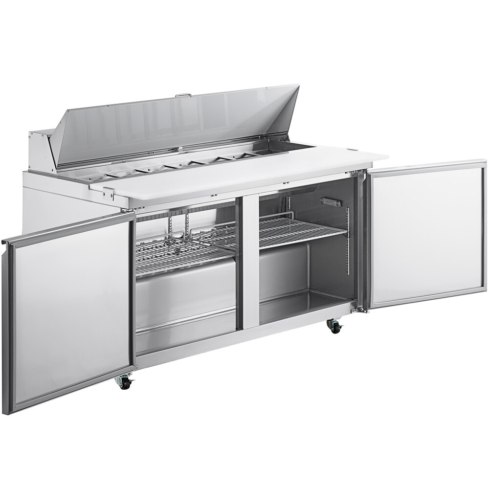 Optimize your back-of-house operations with this Avantco SS-PT-60-AC 60" 2 door stainless steel refrigerated sandwich prep table, and better keep up with customer demands. Whether used in a university, sub shop, or hospital, the unit is sure to help streamline the sandwich prep process with its convenient features and capacity. Its top, for instance, accommodates up to (16) 1/6 size food pans up to 6" deep (sold separately). These are great for holding common sandwich or salad toppings, from eggs and cheese to green pepper or ham. Plus, a lift-up lid encloses the top to maintain proper, food safe temperatures. An extra deep full-length cutting board, which is 15" deep to provide plenty of prep space, is mounted to the table surface but can be removed for thorough cleaning.