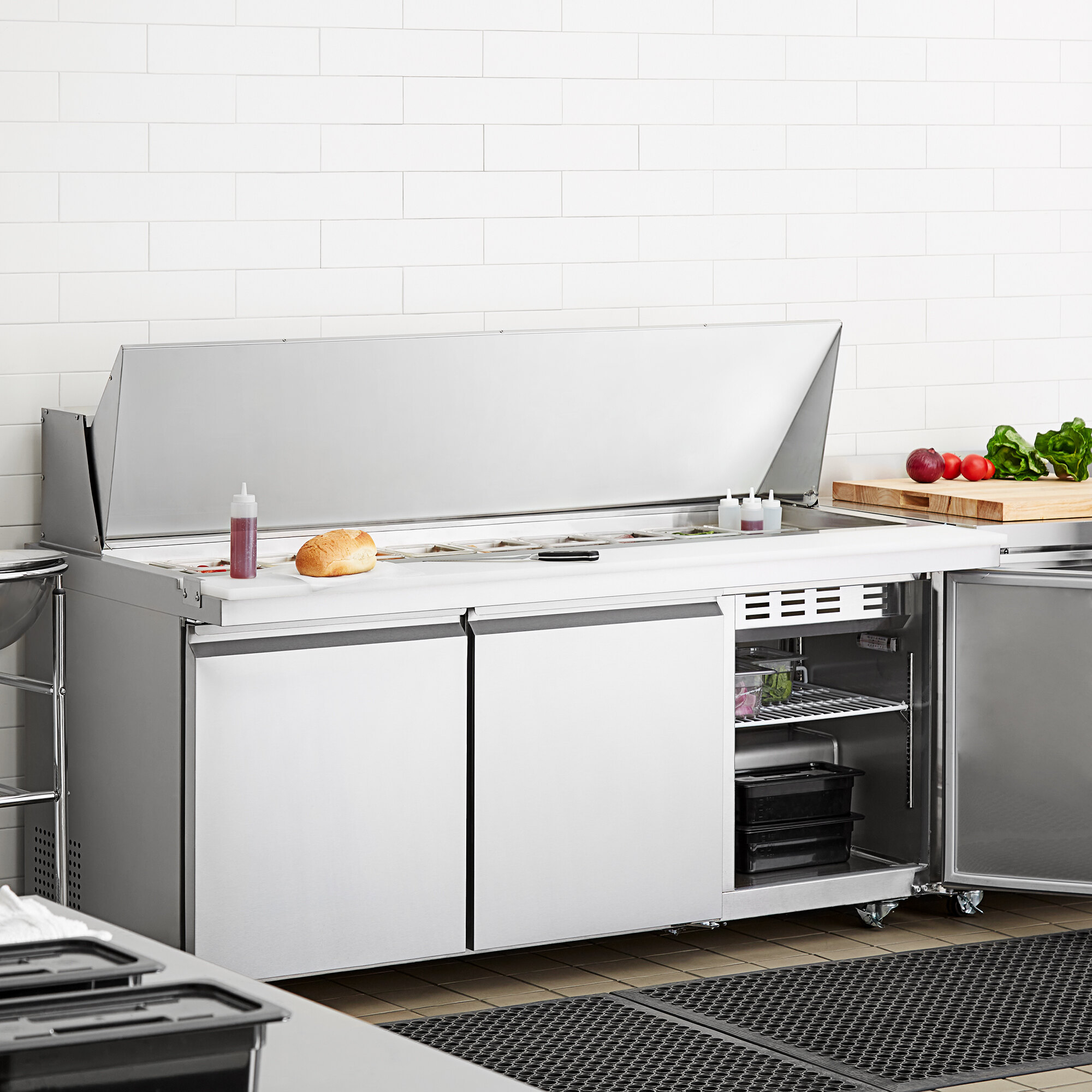 Optimize your back-of-house operations with this Avantco SS-PT-71M-HC 70" 3 door mega top stainless steel refrigerated sandwich prep table, and better keep up with customer demands. Whether used in a university, sub shop, or hospital, the unit is sure to help streamline the sandwich prep process with its convenient features and capacity. Its top, for instance, accommodates up to (30) 1/6 size food pans up to 6" deep (sold separately). These are great for holding common sandwich or salad toppings, from eggs and cheese to green pepper or ham. Plus, a lift-up lid encloses the top to maintain proper, food safe temperatures. A full-length cutting board, which is 8" deep, is mounted to the table surface, providing a place for slicing ingredients and assembling orders.