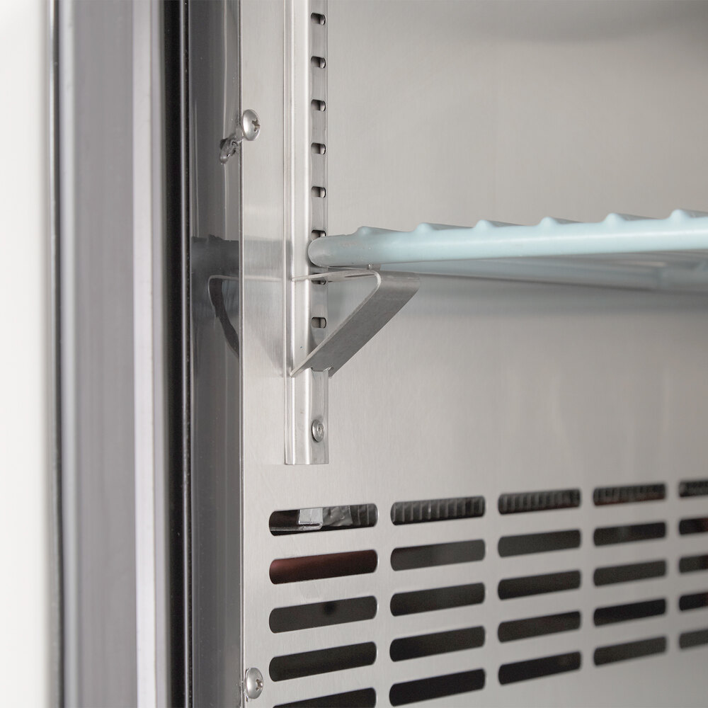 This back bar refrigerator ensures optimal performance by operating with a 3/7 hp refrigeration system that circulates R290 hydrocarbon refrigerant to maintain temperatures from 33-40 degrees Fahrenheit. R290 refrigerant has an ozone depletion potential (ODP) of 0 and a global warming potential (GWP) of 3, making it an energy-efficient choice for your business. The foamed-in-place polyurethane insulation provides the refrigerator with additional structural integrity and ensures that all beverages held in the unit remain at cool temperatures and are ready for immediate service to customers! The unit requires a 115V electrical connection for operation and even comes with adjustable feet for simple, convenient leveling.