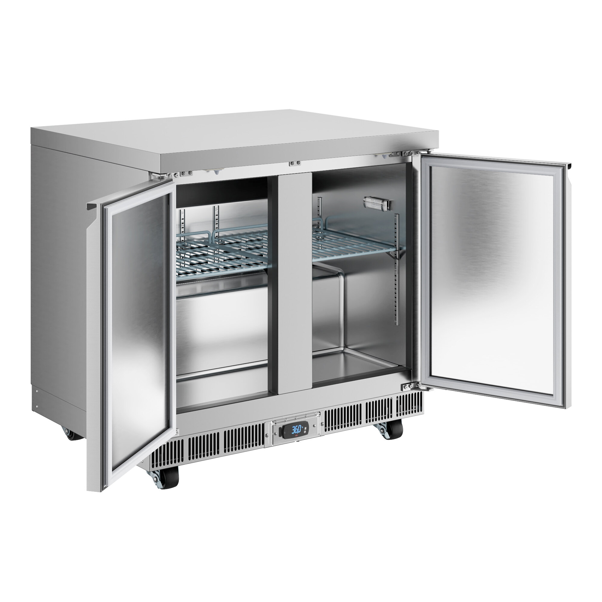 Make cold food storage as convenient as possible with this Avantco VersaHub WiFi-enabled undercounter refrigerator. With a spacious refrigerated portion readily accessible through its doors, the unit opens up to two shelves to help you organize your ingredients and best utilize the 8.7 cu. ft. interior. Plus, because they accommodate up to 88 lb. each, the epoxy-coated steel shelves are well equipped for holding heavy bulk ingredients, from dozens of eggs to jars of condiments and sauces. This model uses the VersaHub platform to provide live notifications, history, and other WiFi-enabled updates.