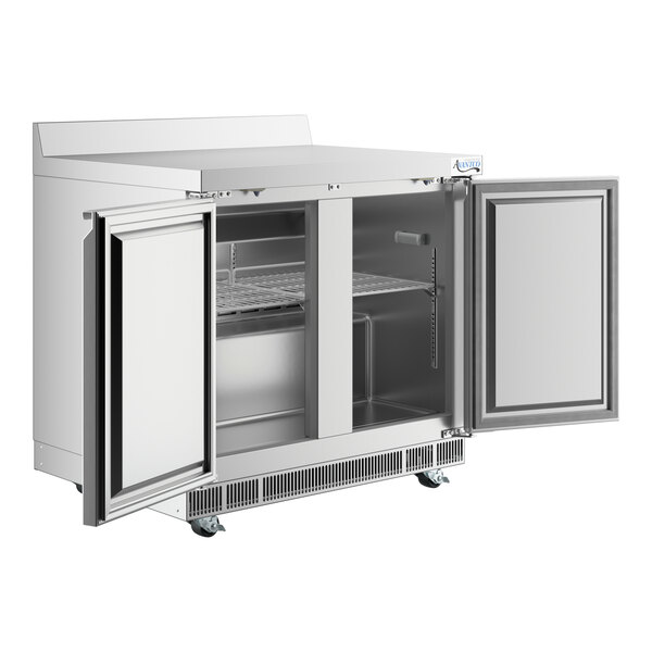Make food preparation as convenient as possible with this Avantco worktop freezer. With a spacious stainless steel worktop surface for slicing, dicing, assembling, mixing, and other food prep tasks, the unit features a 3 1/2" backsplash for wall protection and a refrigerated storage space below. The refrigerated portion is readily accessible through the doors, which open up to two epoxy-coated shelves to help you organize your ingredients and best utilize the spacious interior. Plus, because they accommodate up to 88 lb. each, the shelves are well equipped for holding heavy bulk ingredients, from frozen broccoli and cauliflower to frozen pork chops.