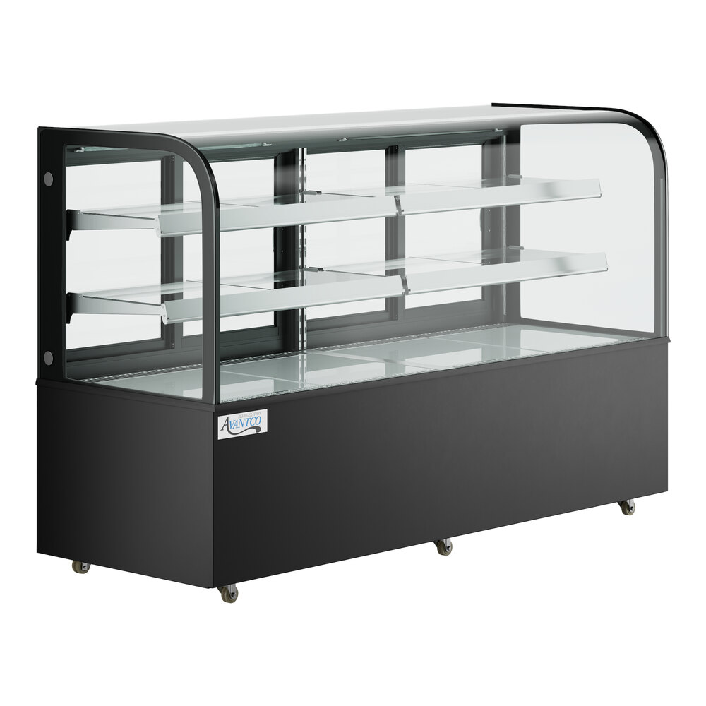 Showcase everything from cakes and pies to eclairs and flan in this Avantco BC-72-HC 71 1/2" curved glass black refrigerated bakery display case! Perfect for bakeries, cafes, coffee shops, and diners, the unit includes glass shelves to help display and organize product. Each shelf holds up to 55 lb. of weight. The top shelf features a 12 1/4" depth with a shelf clearance of 6 7/16" while the bottom shelf boasts a 14 5/8" depth and a 8 9/16" shelf clearance.