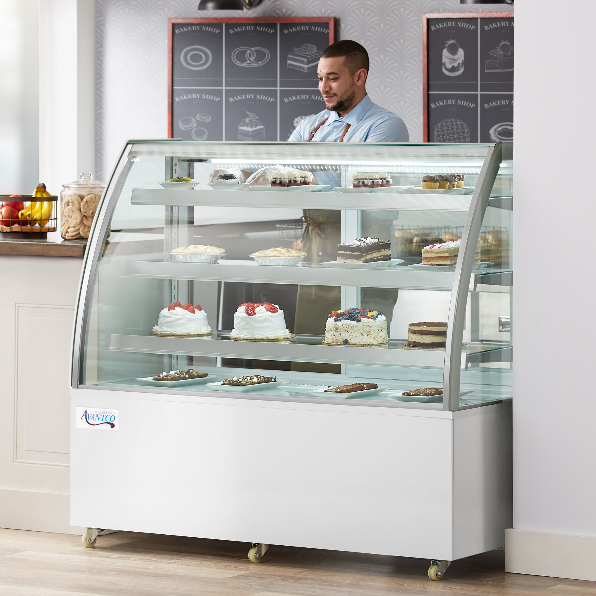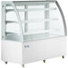Showcase everything from cakes and pies to eclairs and flan in this Avantco BCT-60 61" white 3-shelf curved glass refrigerated bakery display case! Perfect for bakeries, cafes, coffee shops, and diners, the unit includes 3 glass shelves with price tag holders to help display and organize products. In addition to the glass shelves, the base of the unit can be used as a fourth shelf or display area for extra capacity.