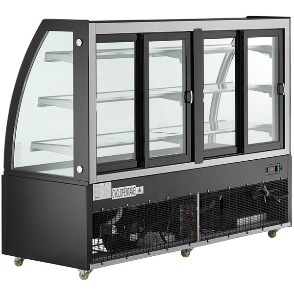 Showcase everything from cakes and pies to eclairs and flan in this Avantco BCT-72 73" black 3-shelf curved glass refrigerated bakery display case! Perfect for bakeries, cafes, coffee shops, and diners, the unit includes 3 glass shelves with price tag holders to help display and organize products. In addition to the glass shelves, the base of the unit can be used as a fourth shelf or display area for extra capacity.