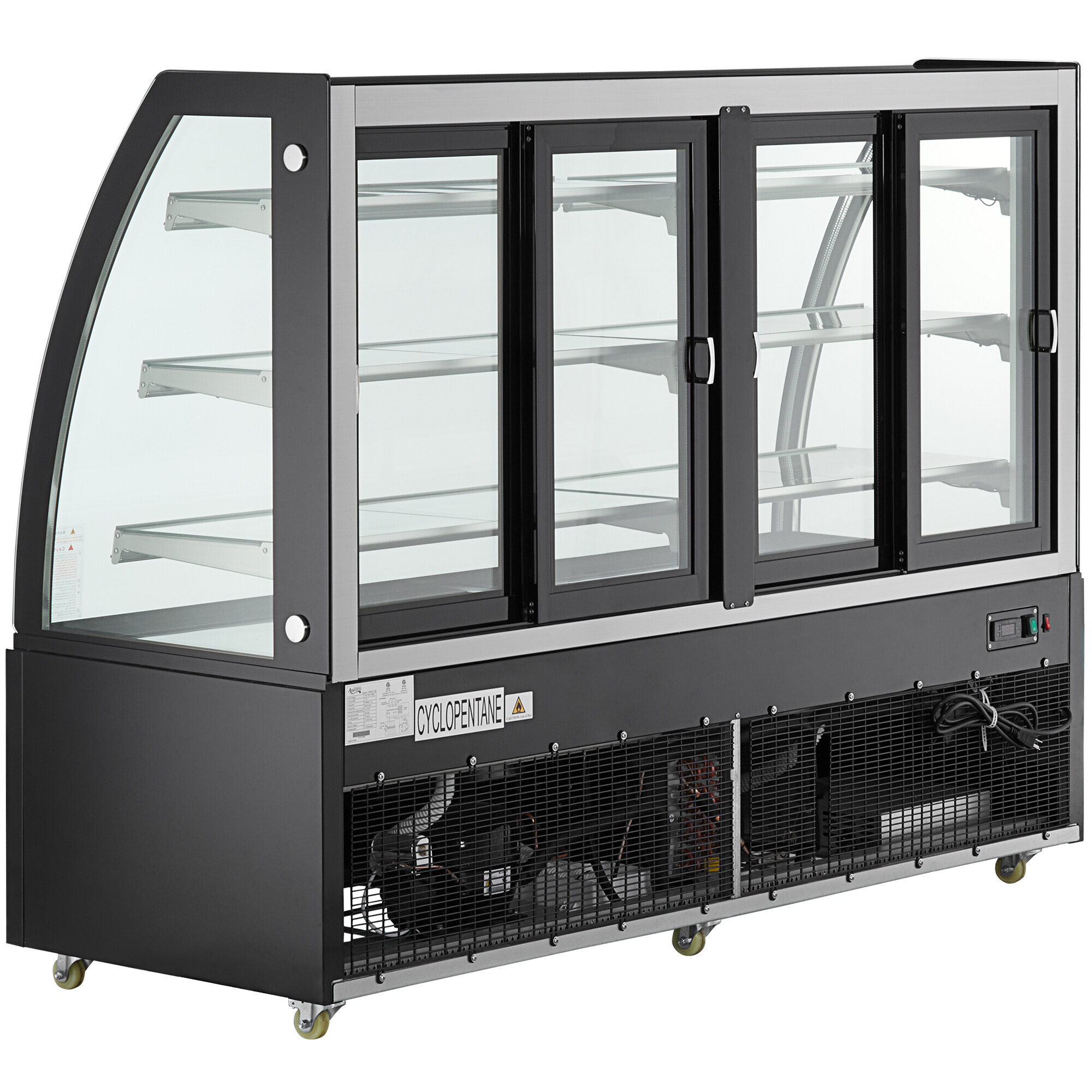 Designed with double paned glass panels on 3 sides and sliding glass rear doors, the case provides maximum product visibility, tempting customers by showing off your decadent desserts from every angle. The sleek frame ensures that the beautiful case fits seamlessly into your business, while the curved front offers a clean presentation. Condensation removal with front glass venting prevents the front of the cabinet from fogging so that the view of your offerings is never obstructed. Plus, LED lighting is built into each shelf, illuminating the product for a bright, enticing display.