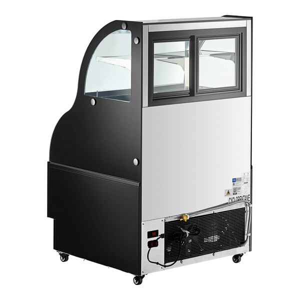 Attractively present your fresh baked goods with this Avantco CAC-36 35 3/8" black curved dual service refrigerated open display merchandiser. This contemporary case keeps contents sanitary while beautifully displaying them on durable glass shelves. Having a dual service open air merchandiser is sure to boost your impulse sales, because customers can clearly see the products you're offering behind the strong glass front or select products of their choosing from the bottom open air part of the unit. It features bright, cool LED lighting to show off your products on the included glass shelves. The versatile top section can be adjusted to hold product at room temperature, refrigerated temperature, or can even be independently adjusted to hold product and accommodate both temperatures at the same time.