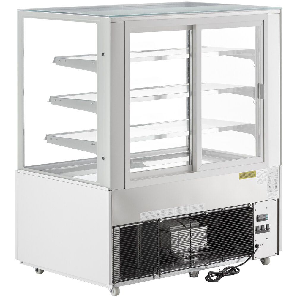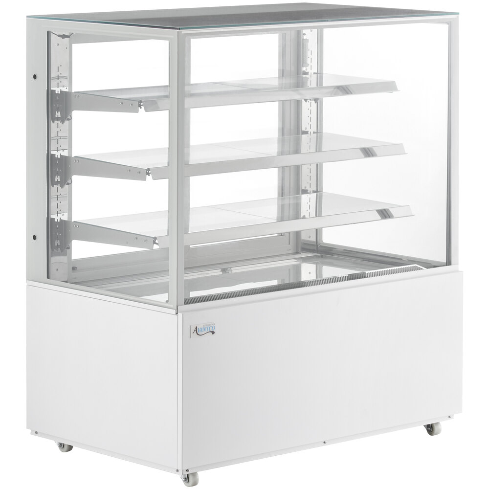 Display your signature cakes, pies, and eclairs with ease using this Avantco BC-48-SW 48" white refrigerated square bakery display case with LED lighting. This floor unit is made to allow you to place your baked goods in a convenient location where they can merchandise themselves to hungry customers. Whether you are looking for a bakery case to place at the front of your cafe near your point of sale, or a refrigerated case to set up in your diner where the customers can see your dessert selection while they eat, this unit is a great option.