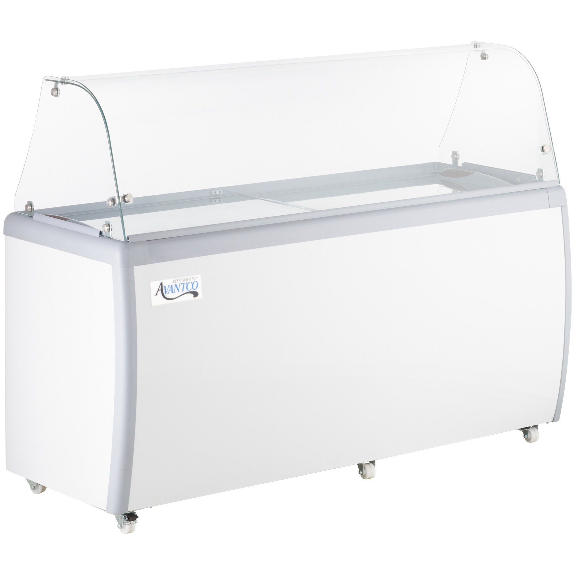 Display, merchandise, and serve a delicious variety of ice cream flavors with this Avantco curved glass ice cream dipping cabinet! Holding up to 12 ice cream tubs at a time, the unit is perfect for ice cream shops, candy stores, dessert bars, and cafeterias. The frozen storage space beneath the display even provides a convenient place for holding up to 10 backup flavors, making it a space-efficient unit for businesses with limited space.