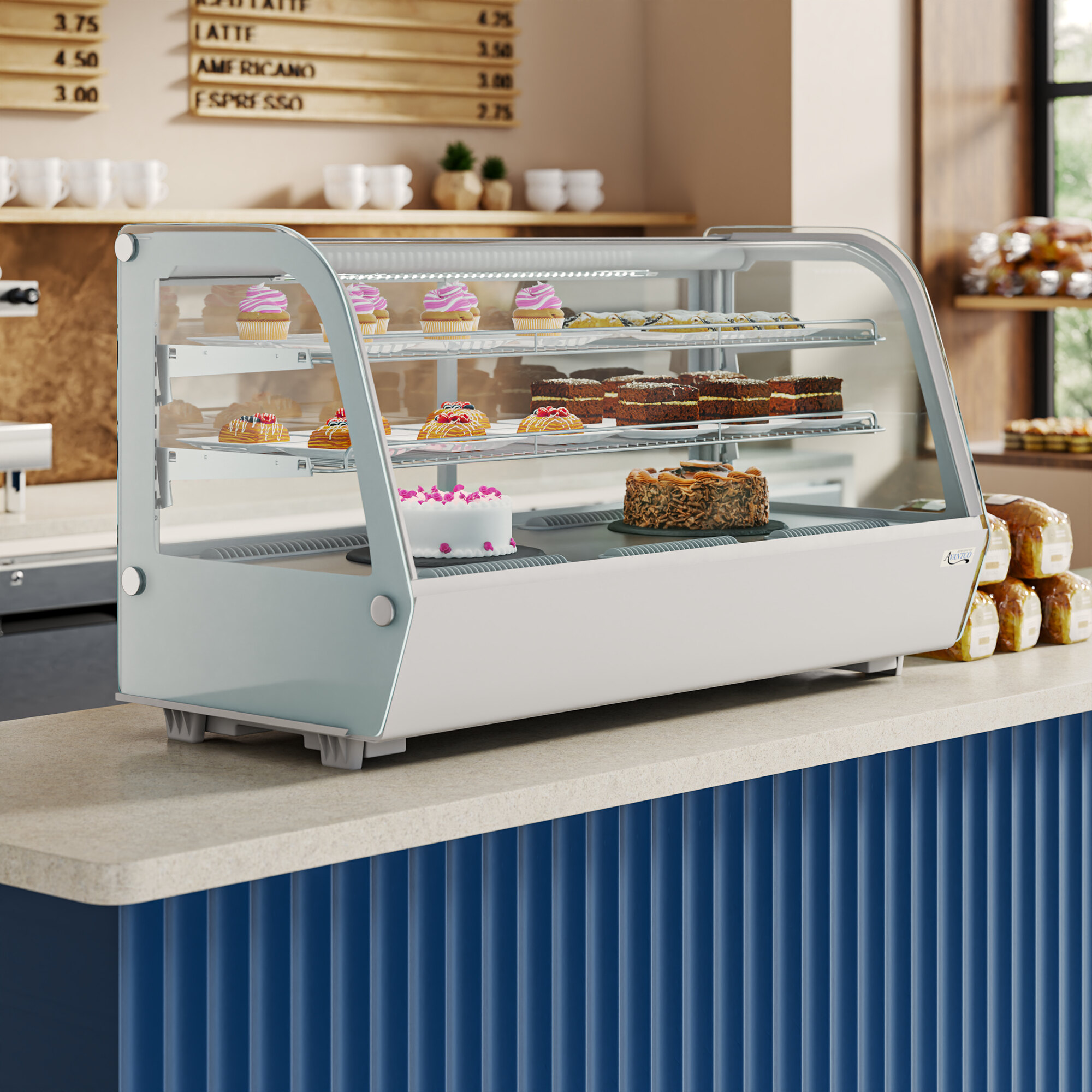 The curved front glass provides and unobstructed view of your food while the side glass panels and the rear glass access doors ensure that customers can see the case's contents from any angle. A specialized air outlet design circulates air against the curved glass front to reduce the build-up of condensation. Without condensation to get in the way, your customers will always have clear visibility to your tempting desserts!