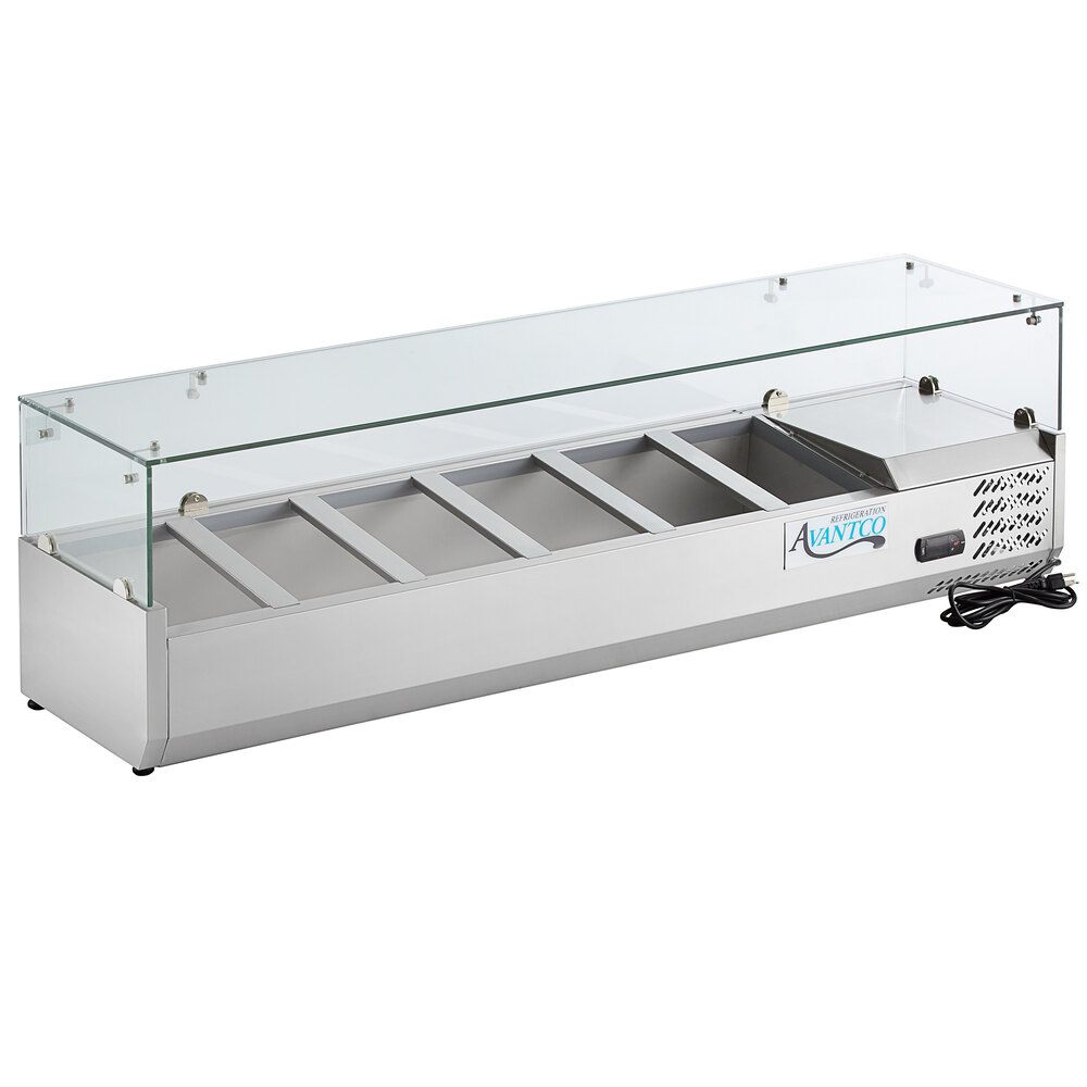 Keep all your essential ingredients and prep items nearby with this Avantco CPT-60 59" refrigerated countertop prep rail with sneeze guard. Perfect for storing items such as sliced tomatoes, pickles, relish, onions, and lettuce, this unit increases the ease of prep work. It ensures the condiments, sandwich toppings, or salad ingredients are kept at the appropriate temperature but still close at hand.