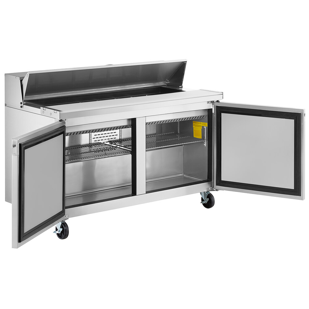Optimize your back-of-house operations with this Avantco A Plus APST-60-16 60" 2 door stainless steel refrigerated sandwich / salad prep table, which allows you to better keep up with customer demand. Whether used in a university, cafeteria, or hospital, the unit will help streamline the salad prep process with its convenient features and capacity. Its top accommodates up to (16) 1/6 size food pans up to 6" deep (sold separately). Divider bars (7) are also included for ultimate convenience. These pans are great for holding common salad or sandwich toppings, from eggs and cheese to green pepper or ham. Plus, a lift-up lid encloses the top to maintain proper, food-safe temperatures. To create better circulation, forced air is released directly on to the food pans.